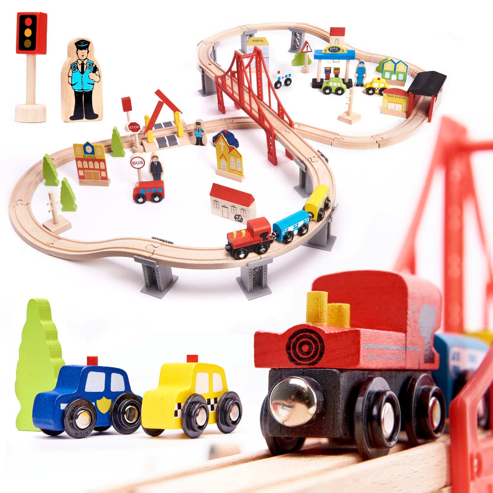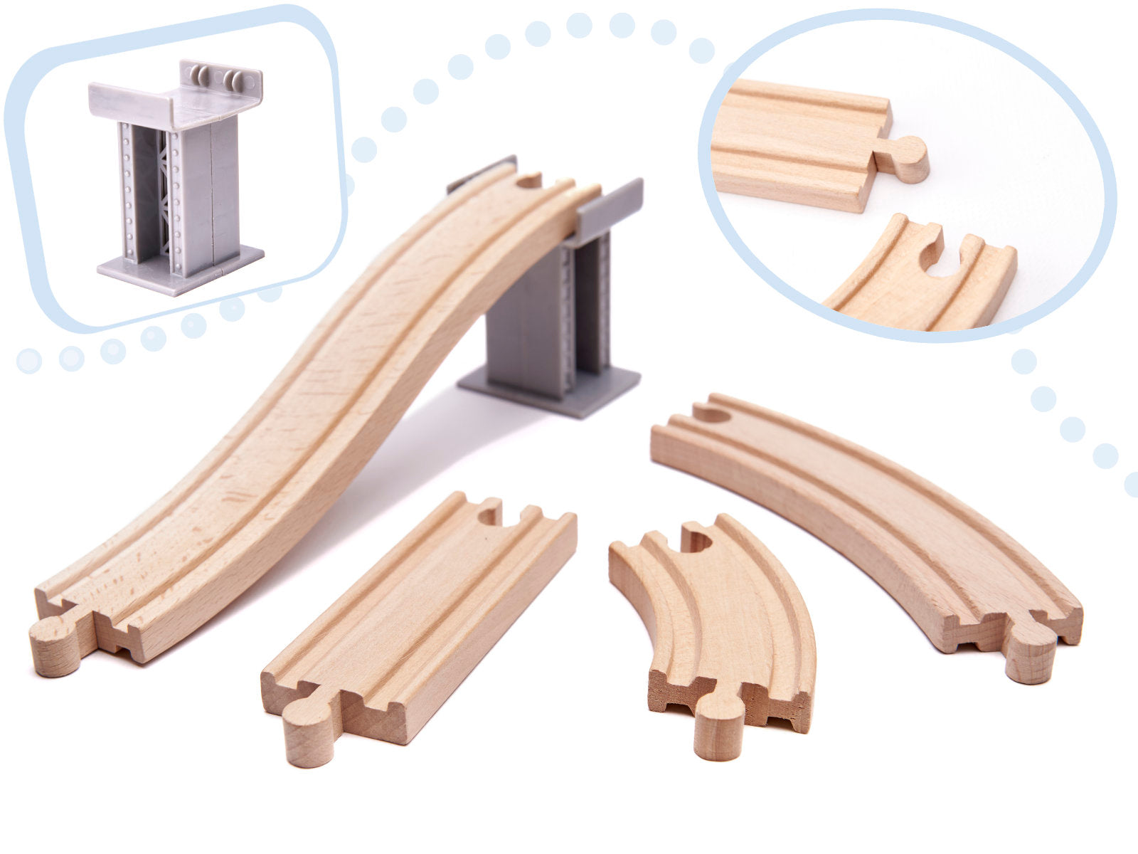 - Magas Minőségű Fa Anyagok: A vonatpálya elemei kiváló minőségű fából készültek, amelyek tartósak és biztonságosak a gyermekek számára. A sima és gondosan megmunkált fa elemek ideálisak a játékhoz, megőrizve tartós tulajdonságaikat.