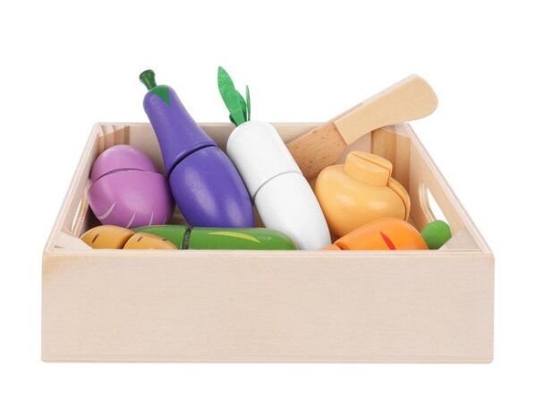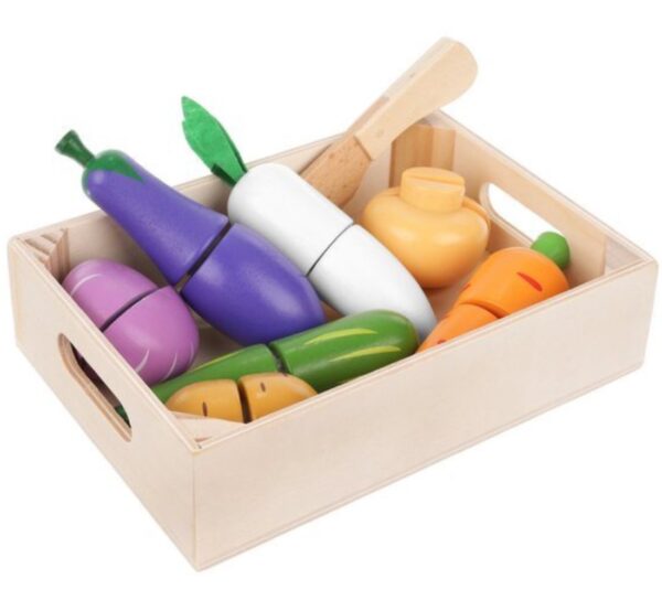 A főzés elengedhetetlen kellékei a zöldségek, melyekből pompás ételeket készíthetnek a gyerekek. A fából készült késsel biztonságosan próbálhatják ki a szeletelés élményét.