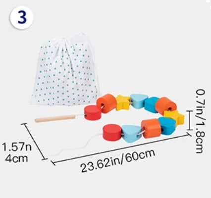 Egy 11 színes fa alakzatokból és zsinórból álló szövettáska tökéletesen fejleszti a gyermekek ujjait.