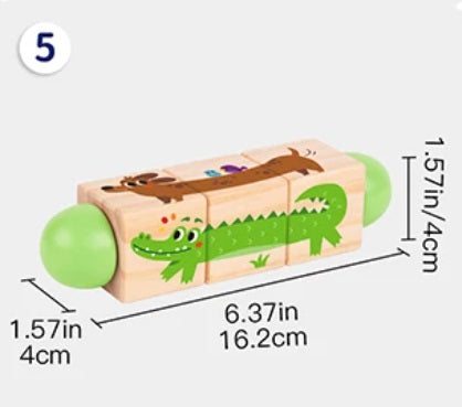 A fából készült állat alakú kockák körbe forognak és csak az oldalak megfelelő kombinációjával kapnak a gyerekek képet az egész krokodilról, rókáról, macskáról vagy kutyáról.