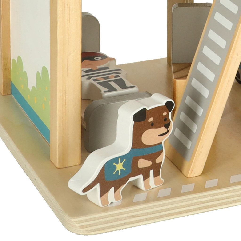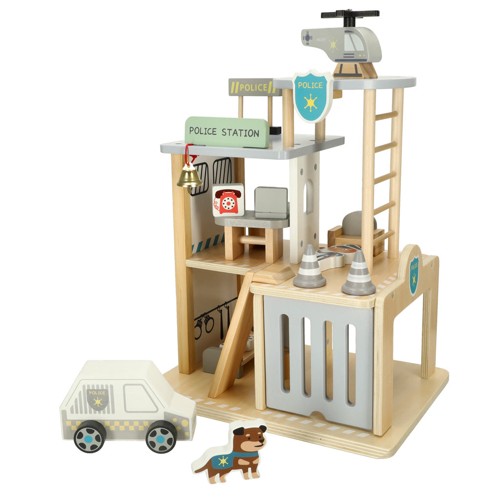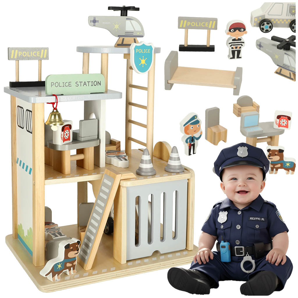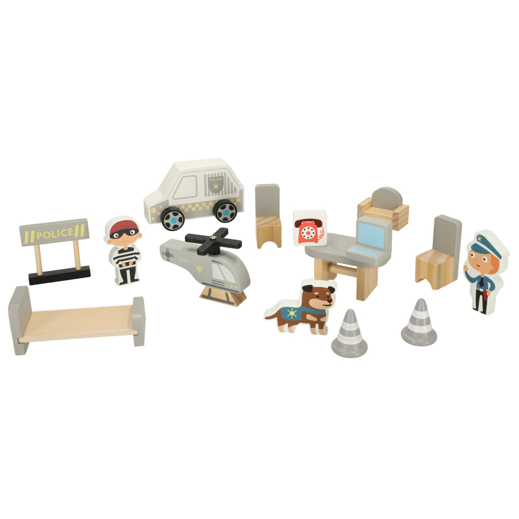 A fa rendőrőrs tökéletes játék a rend és a biztonság kis rajongóinak! A szett minden szükséges elemet tartalmaz a változatos játékhoz: egy rendőrfigurát, egy tolvajt, egy kiképzett rendőrkutyát, számos bútort, egy rendőrautót és egy helikoptert.