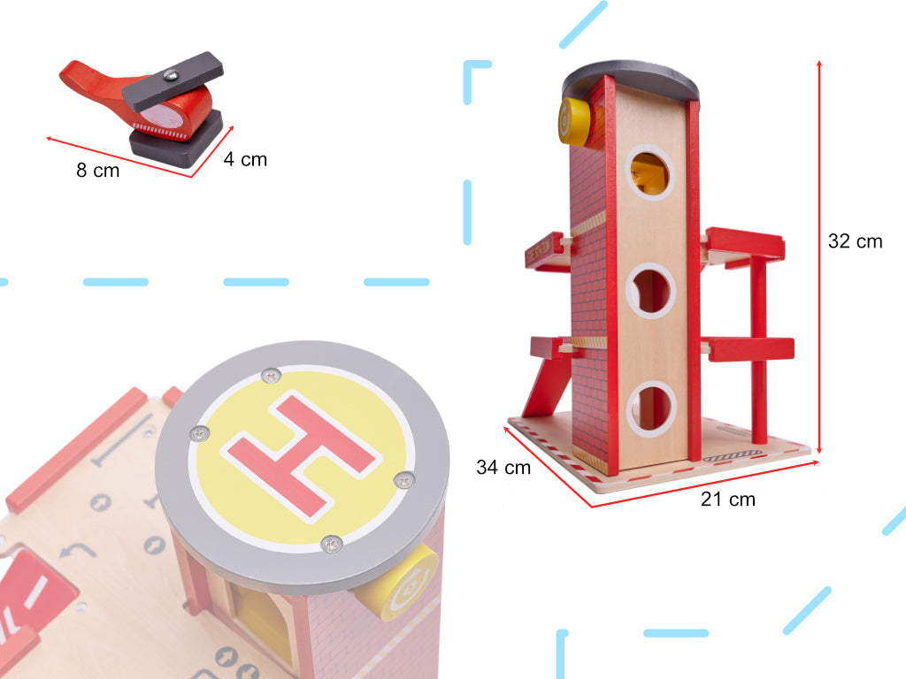 Ez az egyedülálló garázs többszintes! Az első három emelet a tűzoltó járművek parkolására szolgál. Gyermeked más kedvenc autói számára is talál majd helyet a parkoláshoz. A negyedik szint a készletben található helikopter leszállóhelye.