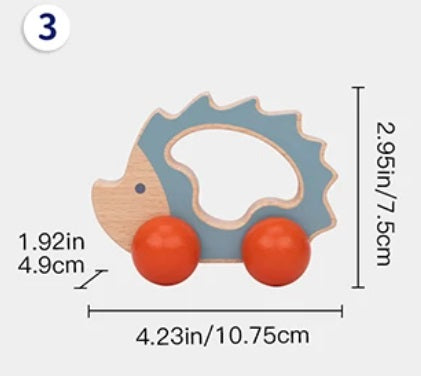 A fából készült sündisznó egy 2 az 1-ben játék - egy csörgő és egy aranyos kisautó.