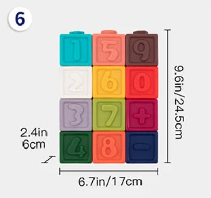 A 12 lágy kockából álló készlet mintákkal - állatokkal, gyümölcsökkel, számokkal és formákkal - rengeteg lehetőséget kínál a játékhoz.