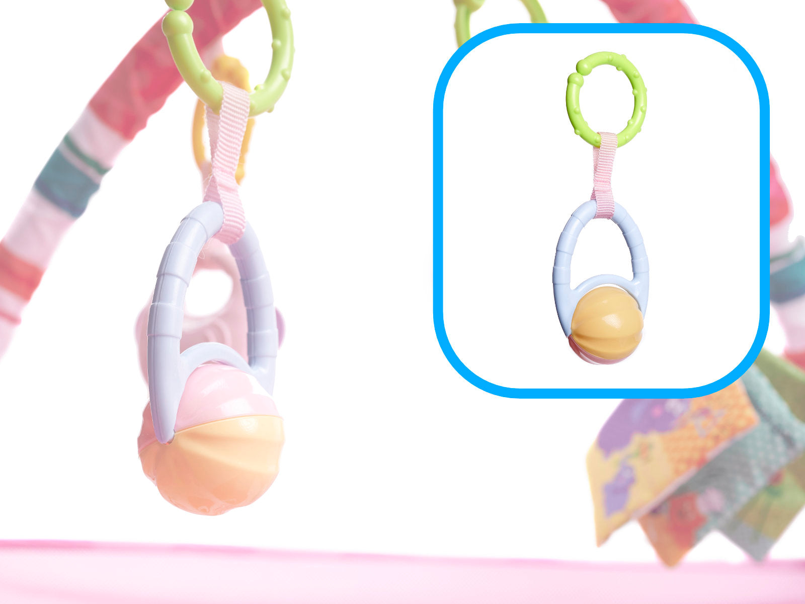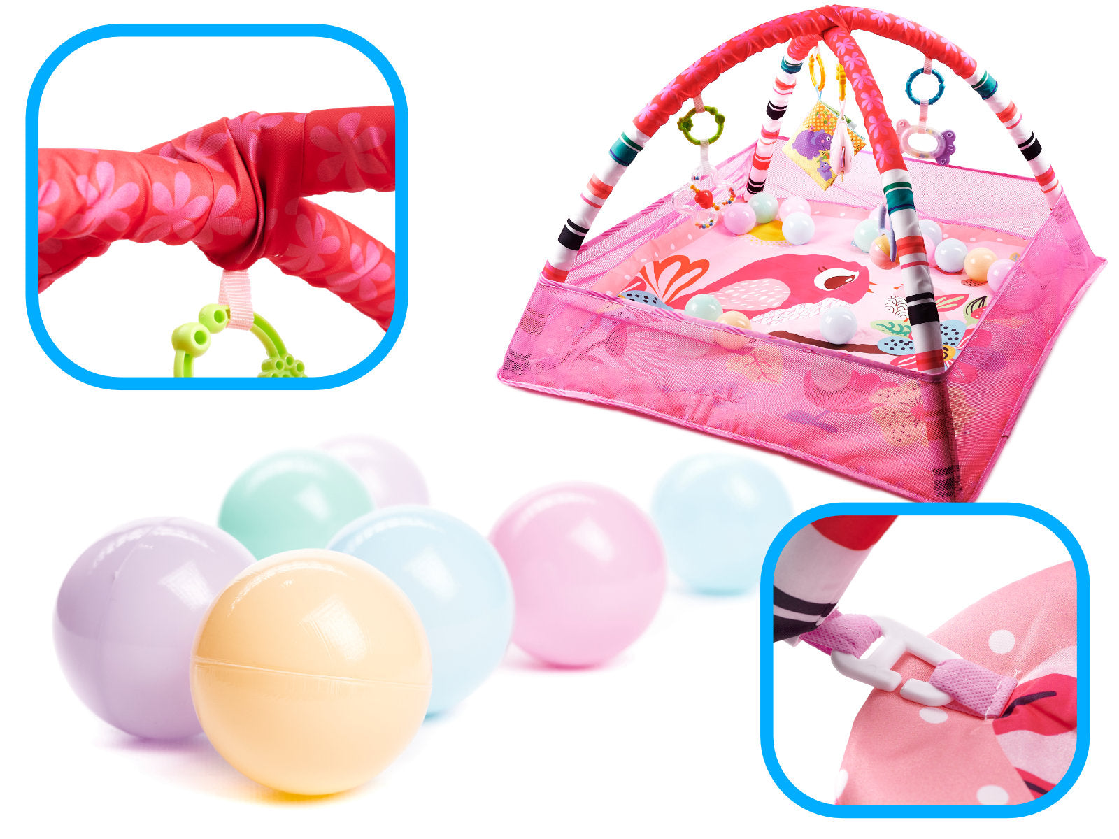 A baba a háton vagy hason fekve figyelheti a környezetét, miközben a keret biztonságérzetet nyújt. Színes játékok lógnak a baba felett, motiválva a kicsit a nyak, kar és láb izmainak erősítésére, valamint az első önálló ülési próbálkozásokhoz. A keret a labdákkal egy biztonságos, vidám labdamedencévé alakítható.