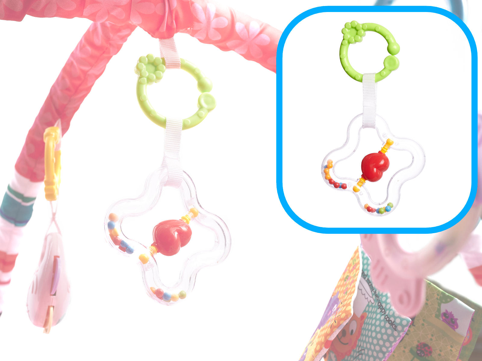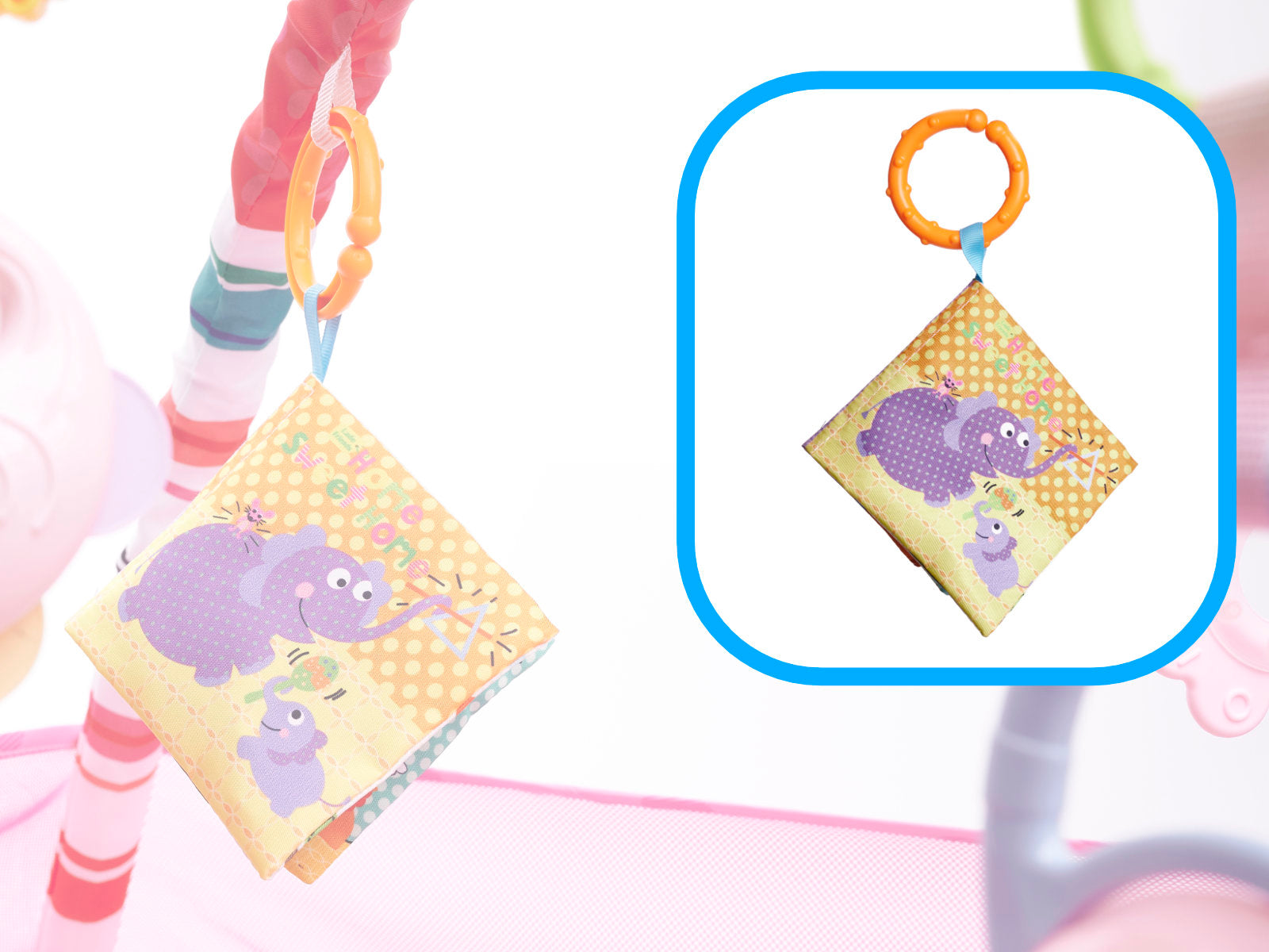 - Színes csörgők és hangot adó, ropogós oldalakkal ellátott könyvecske stimulálja a látást, hallást és tapintást.
