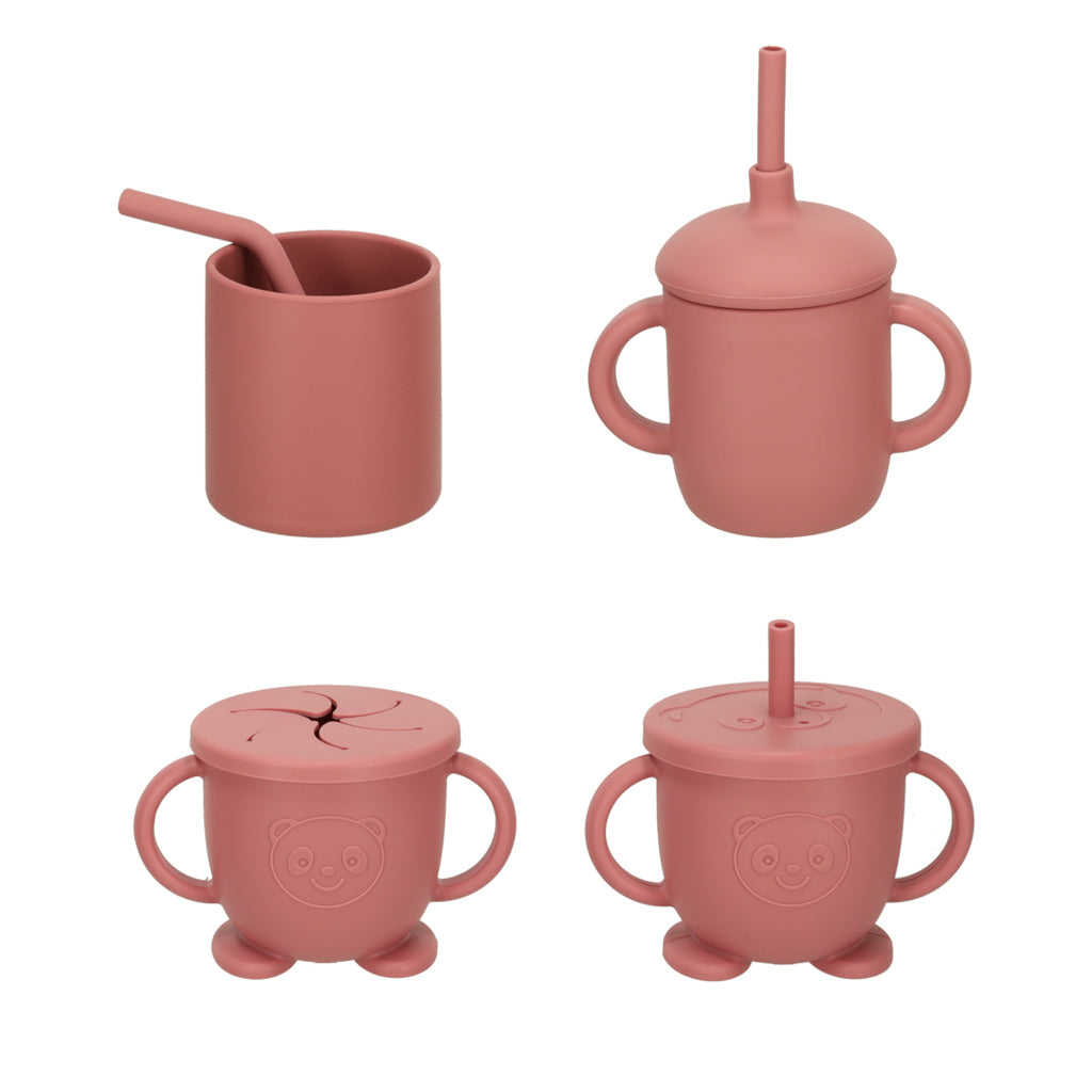 Praktikus és biztonságos étkészlet, amely ideális az önálló evés tanulásához. Minden eleme élelmiszerbiztonságos szilikonból készült, puha, rugalmas és könnyen tisztítható. A tányérok, tálak és poharak tapadókoronggal rendelkeznek, így stabilan a helyükön maradnak, megkönnyítve a gyermek számára a tanulási folyamatot. A csomag kétféle evőeszköz-készletet, két tányért rekeszekkel, két tálat, négyféle poharat, előkét, cumitartozékokat és egy praktikus uzsonnásdobozt is tartalmaz – mindezt egységes sötét rózsaszín színben.