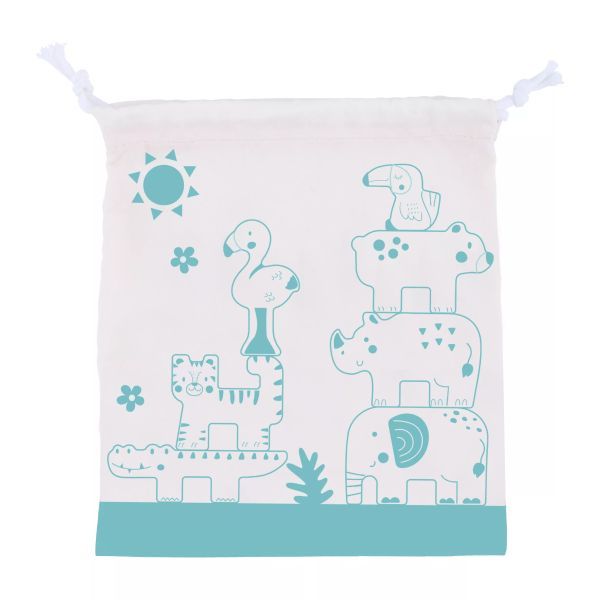 Ez az igényesen kidolgozott, élénk színű játék tigris, elefánt, krokodil, süni, flamingó és róka figurákat tartalmaz, amelyek egyszerűen és többféleképpen egymásra helyezhetők. A játékhoz tartozik egy textilből készült zsák, amely megkönnyíti a tárolást. Kiváló minőségű faanyagból készült, környezetbarát és biztonságos, nem tartalmaz toxikus anyagokat. Mérete: 21 x 17 x 4 cm.